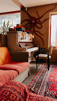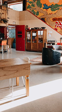 Tu y trouveras une grande salle conviviale pour te détendre ou participer à un atelier, un petit salon cosy avec un piano pour des moments plus calmes, une mezzanine lumineuse pour bricoler ou travailler, mais aussi un local de répétition tout équipé, un atelier de sérigraphie pour imprimer tes créations, et même un jardin inspirant où chacun·e peut jardiner librement.